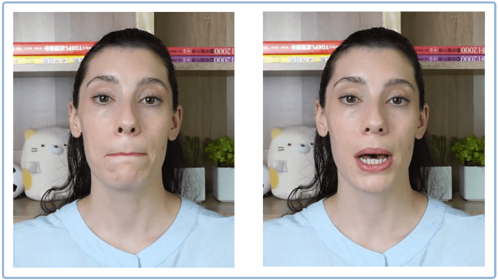 [p]是無聲子音,發音類似注音ㄆ。[p]是雙唇音,由上唇和下唇使力一起發出來的音。無聲子音的發音方式,請看綜合課程裡〈無聲子音如何發音〉的影片。請看下面的圖片,這是美國老師發音[p]兩個嘴巴的動作,先閉上雙唇,然後用力把氣流推出來。