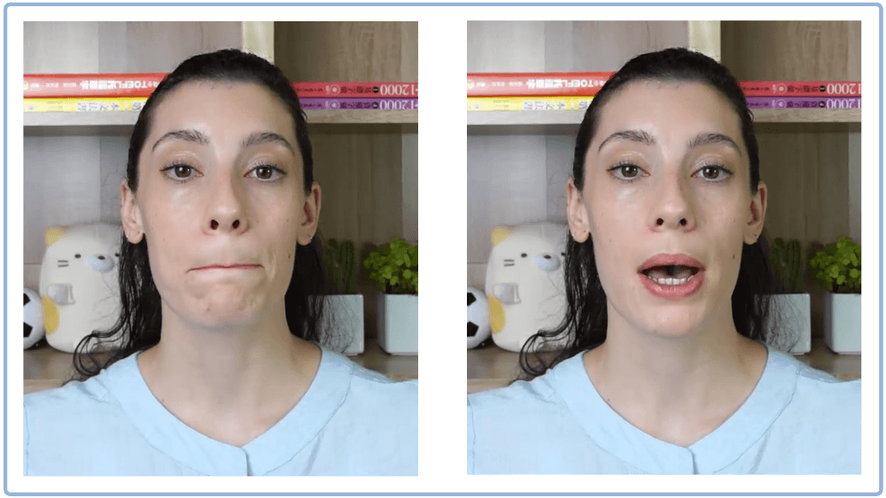 [p]是無聲子音,發音類似注音ㄆ。[p]是雙唇音,由上唇和下唇使力一起發出來的音。無聲子音的發音方式,請看綜合課程裡〈無聲子音如何發音〉的影片。請看下面的圖片,這是美國老師發音[p]兩個嘴巴的動作,先閉上雙唇,然後用力把氣流推出來。
